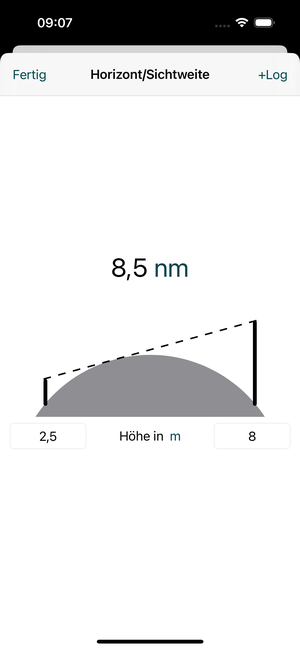 Horizont/Sichtbarkeit berechnet die Entfernung zum Horizont bzw. einem anderen Objekt basierend auf der Höhe. Tippen Sie auf die Einheiten, um zwischen km/nm bzw. m/ft umzuschalten.