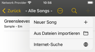 Um neue Songs anzulegen oder zu importieren, wählen Sie eine Kategorie und tippen dann den +-Button in der Toolbar oben rechts. Dort können Sie auch eine einfache Internet-Suche nach Songs im chordpro-Format starten.