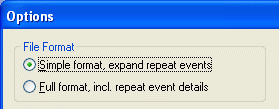The following step-by-step instructions explain how to import DIMEX data into MS Outlook 2003. Import into other Outlook versions may work similar. Open the DIMEX options dialog and set the format to Simple format, expand repeat events. Make sure the export time span is correct. Note: Outlook Calendar does not understand the Palm Calendar repeat event types, so you can only import "simple" (non-repeated) appointments. DIMEX will expand the repeat events into a series of simple events in the selected time span.