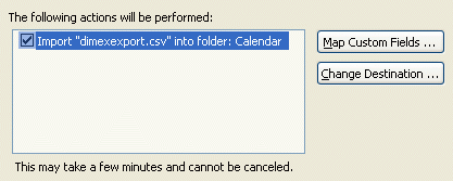 On the final wizard page, click on Map Custom Fields to define the mapping between Palm Desktop (DIMEX) appointment fields and Outlook fields. You can drag-and-drop fields from the left column to the right column to define the mapping. We suggest the following mapping: | Outlook Field | Mapped From DIMEX | | Subject | Text | | Start Date | Date | | Start Time | Start Time | | End Date | (leave empty) | | End Time | End Time | | All day event | Untimed | | Reminder on/off | Alarm | | ... | (leave empty) | | Description | Note | | Location | Location | | Private | Private |