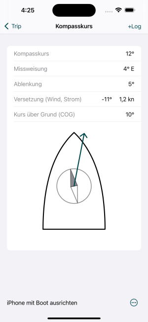 Kompasskurs verwendet den magnetischen Kompass des iPhones und berechnet Missweisung und Versetzung durch Strom und Wind. Sie können Ihre eigene Ablenkungstabelle erstellen (über das Menü unten rechts) indem Sie an einem Tag ohne Wind und Strom verschiedene Kurse fahren und den angezeigten Versatz in die Tabelle eintragen.