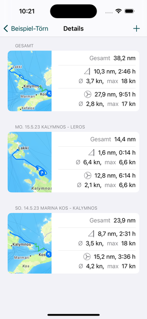 Mit dem +-Button oben rechts können Sie eigene GPX-Dateien zum Törn hinzufügen. Die Statistiken werden entsprechend aktualisiert. Exportieren oder löschen Sie Tracks aus dem Menü des entsprechenden Tages.