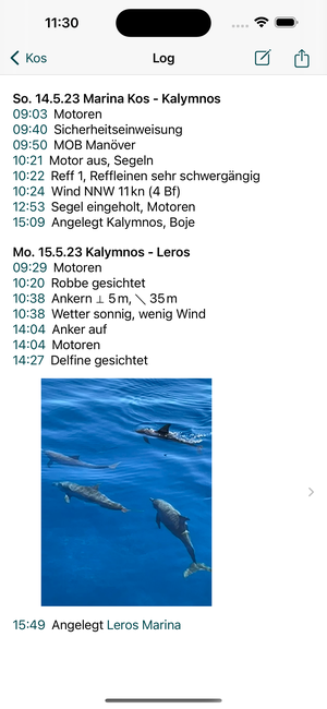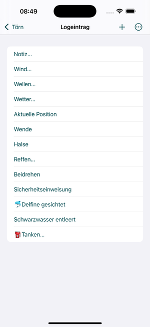 Tippen Sie auf Logeintrag... um eine Notiz oder einen der vorderfinierten Texte mit Zeitstempel ins Log einzutragen, etwa die aktuelle Windgeschwindigkeit, Wellenhöhe, Wetter oder Reffs.