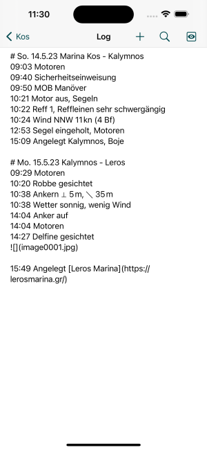 Im Log können Sie Markdown verwenden, etwa # für eine Zwischenüberschrift oder *...* für Hervorhebungen. Fügen Sie Fotos über den +-Button ein. Links und Telefonnummern werden automatisch erkannt.