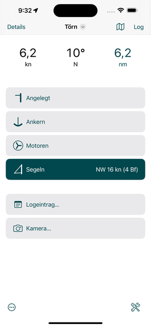Jedesmal wenn Sie den Status ändern, erzeugt SkipperLog einen Eintrag mit Uhrzeit im Log, z.B. 12:35 Motor aus, Segel gesetzt.