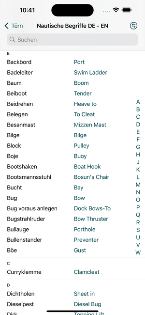 Ein kleines Wörterbuch enthält nautische Begriffe in Deutsch und Englisch. Tippen Sie auf einen Begriff, um ihn zu kopieren oder vorlesen zu lassen.