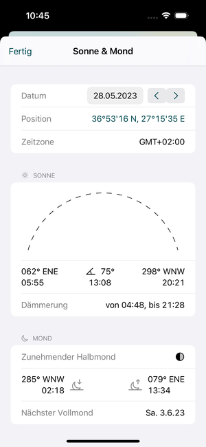 Sonne & Mond zeigt die Auf- und Untergangszeiten und Positionen von Sonne und Mond sowie die Zeiten der nautischen Dämmerung an. Die Zeiten beziehen sich auf Meereshöhe. Tag und Ort können beliebig gewählt werden, es wird dann jeweils die Zeitzone des ausgewählten Ortes verwendet.