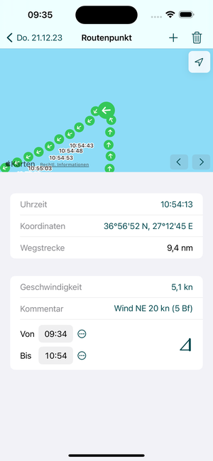 Tippen Sie auf die zurückgelegte Distanz oder auf das Kartensymbol, um in die Kartenansicht zu gelangen. Die Routen für die verschiedenen Tage können Sie mit dem Menü oben oder den Vorwärts/Rückwärts-Buttons unten rechts wechseln. Gesegelte Strecken sind grün markiert, Strecken unter Motor blau. Ein kleiner Kreis mit einer Textblase oder einem Symbol markiert einen Kommentar für den Routenpunkt, z.B. einen Log-Eintrag.