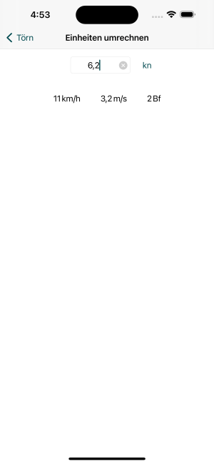 Mit dem Einheitenrechner können Sie schnell verschiedene nautische Einheiten umrechnen. Tippen Sie länger auf einen der umgerechneten Werte, um ihn in die Zwischenablage zu kopieren.
