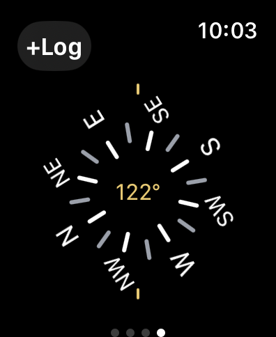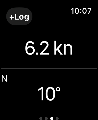 Wischen Sie nochmal nach links für einen Kompass. Tippen Sie auf den Bildschirm, um den Kompass anzuhalten oder wieder zu starten (z.B., wenn Sie eine Peilung vornehmen). Tippen Sie auf +Log, um die Peilung ins Log zu übernehmen. Hinweis: Der Kompass der Apple Watch ist nicht immer zuverlässig, z.B. wenn Sie ein metallisches oder magnetisches Armband verwenden oder metallische Objekte in der Nähe sind. SkipperLog zeigt dieselben Werte wie die eingebaute Apple Watch Kompass-App.