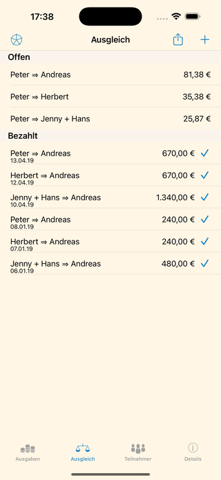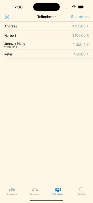 Neben jedem Teilnehmer wird der Gesamtbetrag der Ausgaben angezeigt, die dieser Teilnehmer bisher beigesteuert hat (abzügl. eventueller Ausgleichszahlungen).