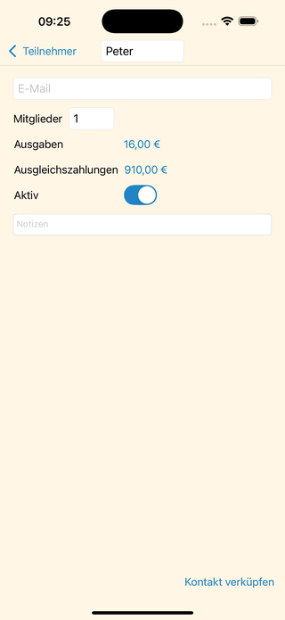 Tippen Sie auf einen Teilnehmer, um den Namen zu ändern oder mehr Details einzugeben, wie die E-Mail-Adresse (wird beim Senden von Zahlungserinnerungen verwendet) oder die Anzahl von Personen in einer Teilnehmergruppe (z.B. ein Paar oder eine Familie). Hinweis: Sie können auch gebrochene Zahlen eingeben, z.B. 1,5 für einen Erwachsenen mit Kind. Geben Sie 0 ein, wenn ein Teilnehmer nicht am Ausgleich teilnehmen soll (z.B. "Skipper frei").