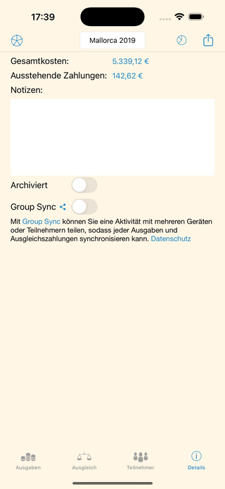 Schalten Sie Group Sync auf dem Details-Tab ein, um Ausgaben und Ausgleichszahlungen mit anderen iPhone- Geräten oder Benutzern zu synchronisieren. Sobald Group Sync aktiv ist, können sie mit dem Button Einladung senden einen speziellen Link an sich selbst oder einen anderen Benutzer verschicken. Sie können zwischen einem Link, der Änderungen erlaubt, und einem Link der die Daten schreibgeschützt synchronisiert, wählen.