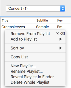 Playlists (sets) are collections of songs for a special purpose, e.g. for a concert, or for practising. Playlists contain references to songs (by title/subtitle, independent of their category). You can add songs to multiple playlists, and one song can occur multiple times in one playlist. You can switch between song list and playlist with the List selector in the toolbar.